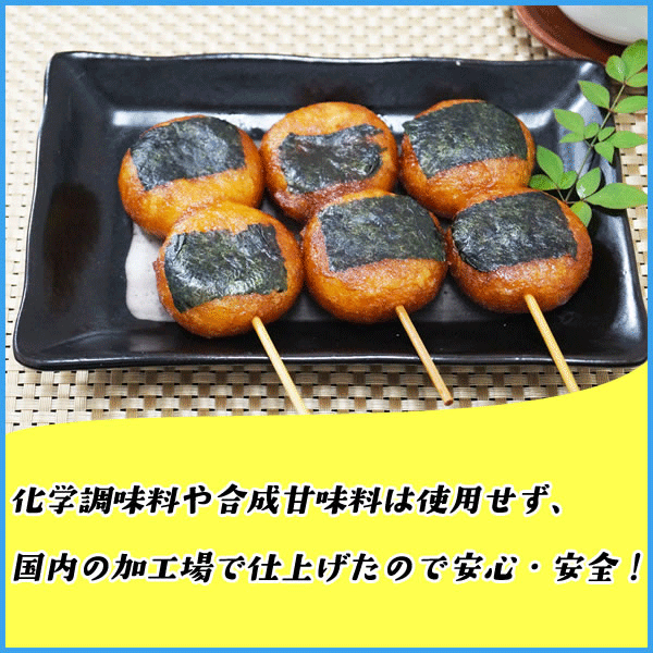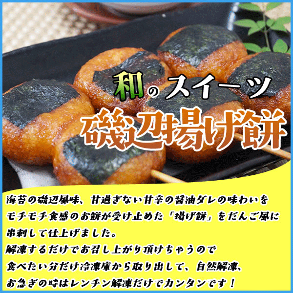 商品 揚げ餅 内容量:1本65g×5串 原材料:上新粉、糖類(砂糖、水あめ)、還元水あめ、植物油、しょうゆ、のり、米発酵調味料、かつおエキス、昆布エキス/ 増粘剤(加工でん粉)、(一部に小麦・大豆を含む) 生(原)産地:日本 保存方法:-18℃以下で保存 賞味期限:商品に業務用冷凍庫保管での賞味期限が記載されますが、ご家庭用冷凍庫での保管は1ヶ月を推奨しております。